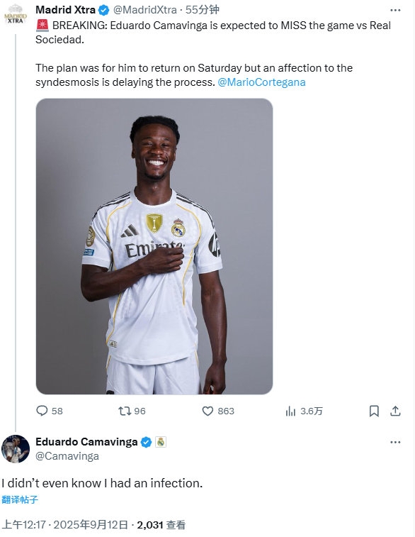“TA:卡马文加伤缺vs皇社”,卡马文加:我咋不知道自己伤了🤣 xiaoqiao 2026-01-26 西甲 42 0 09月12日讯 此前据The Athletic记者Mario Cortegana报道,皇马中场卡马文加预计将缺席客场对阵皇家社会的西甲联赛。卡马文加随后在该条新闻下回复:“我咋不知道自己受伤了。”