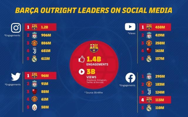 巴萨是社交网络上最受欢迎的俱乐部